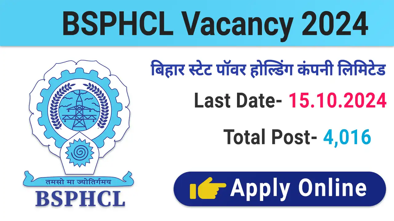 Bihar State Power Holding Company Ltd (BSPHCL) invites online applications for recruitment to the post of Assistant Executive Engineer (AEE), Junior Electrical Engineer (JEE), Correspondence Clerk (CC), Store Assistant (SA), Junior Accounts Clerk (JAC) and Technician Grade III for 4016 vacancies. All eligible and interested candidates can apply online at BSPHCL official website bsphcl.co.in from 01st October 2024 to till the application last date 15th October 2024 for various post recruitment in BSPTCL, NBPDCL, BSPGCL, SBPDCL.