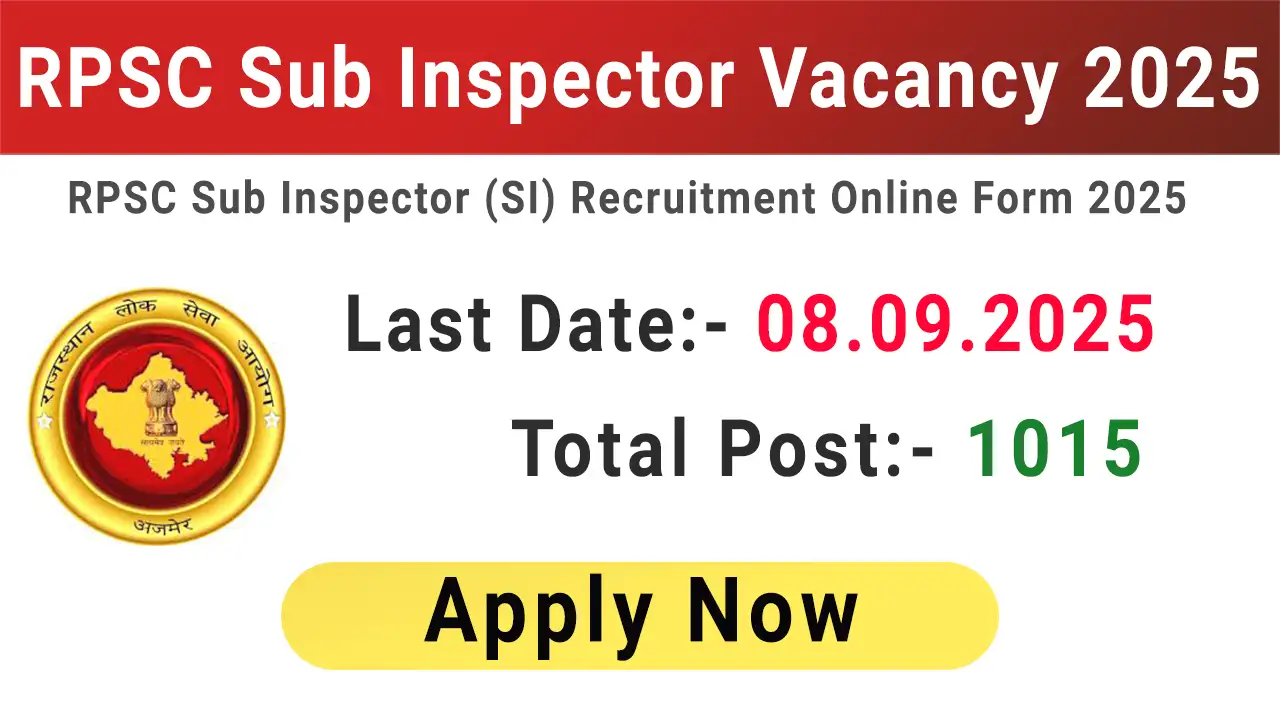 Rajasthan Public Service Commission (RPSC) invites online applications for recruitment to the post of Sub Inspector (SI)/ Platoon Commander for 1015 vacancies. All eligible and interested male and female candidates can apply online at RPSC official website rpsc.rajasthan.gov.in from 10th August 2025 to till the application last date 08th September 2025 for Sub Inspector SI recruitment in RPSC.